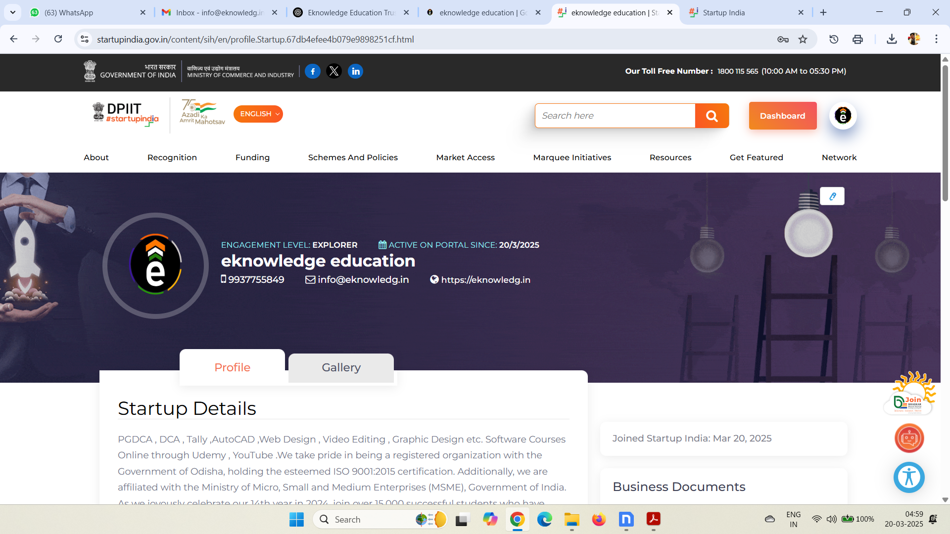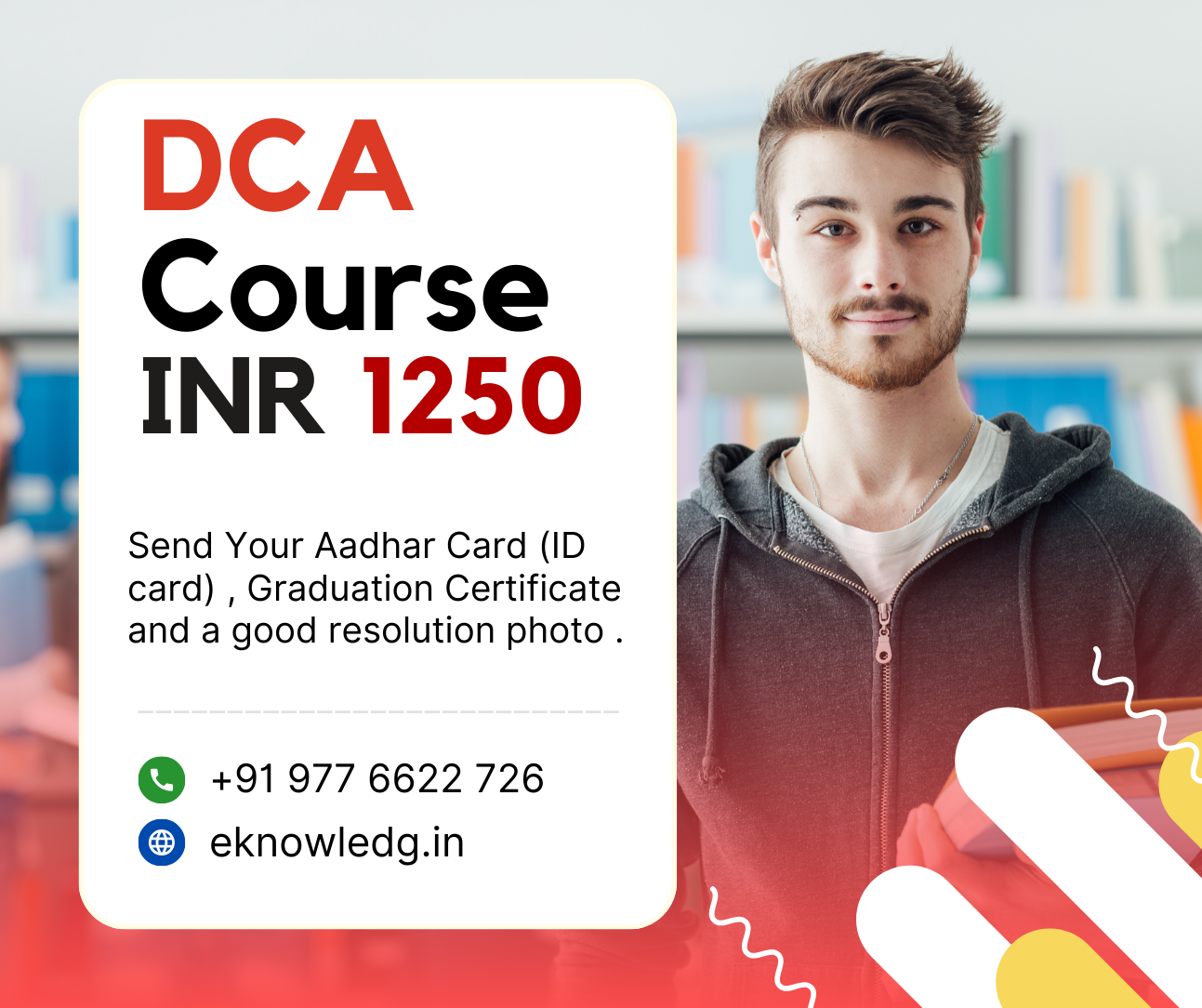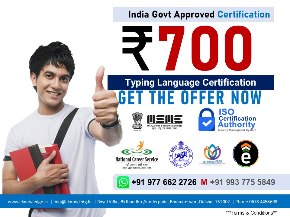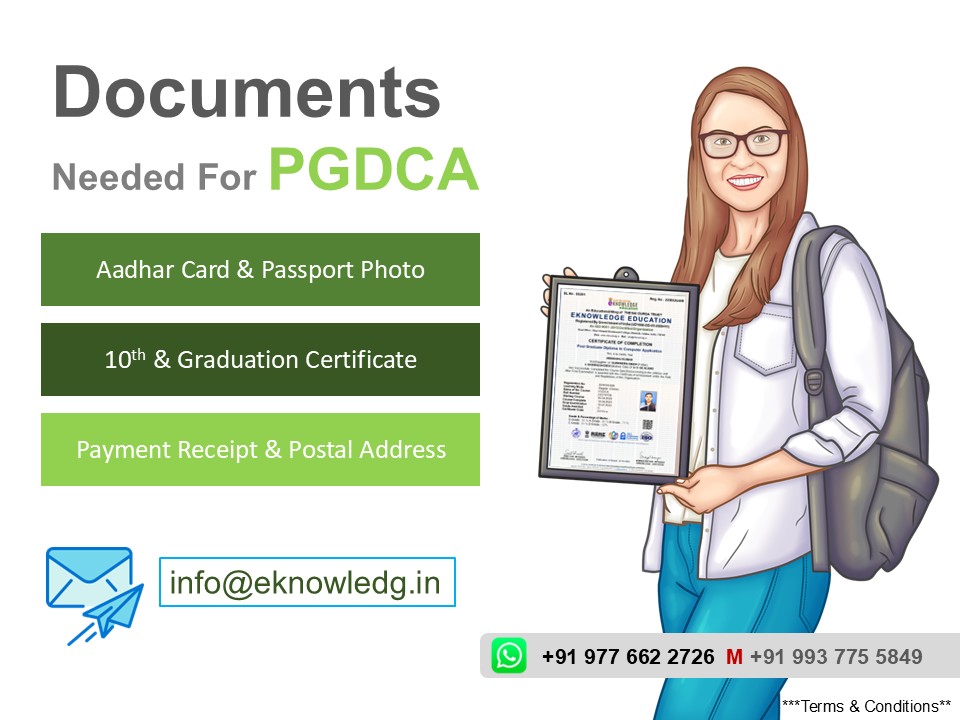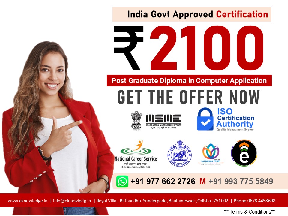 PGDCA , DCA , Tally , AutoCAD ,Office Automation ,Anger Managment ,Phython , O Level , Video Editing ,Hardware ,Cyber Sequrity , Photoshop You Can Use this Certificate in Every Government & Private Sector Jobs or Promotions . Digital Verification of Certificate is Possible . ISO 9001;2015 Certified Organization . MAIL info@eknowledg.in Mob : 919776622726